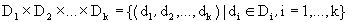 Пусть D1, D2 ,…, Dk – произвольные конечные и не обязательно различные множества (домены). Декартово произведение этих множеств определяется следующим образом: