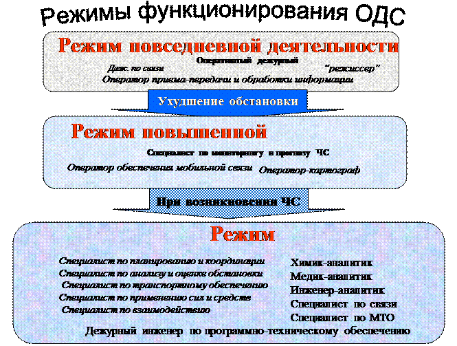 Ситуационные центры региональных органов управления могут работать в различных режимах, в зависимости от которых, различным может быть и состав ЛПР и специалистов, и территориальное размещение рабочих мест и источников информации, и регламент проводимых работ.