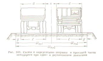 Ширина проезжей часта дороги Ш п.ч., зависит от ширины машин по скатам колес с (примерно равна ширине кузова а), ширины предохранительной полосы у между наружным колесом машины и кромкой проезжей части и безопасного зазора х между кузовами встречных машин: при однополюсной движении