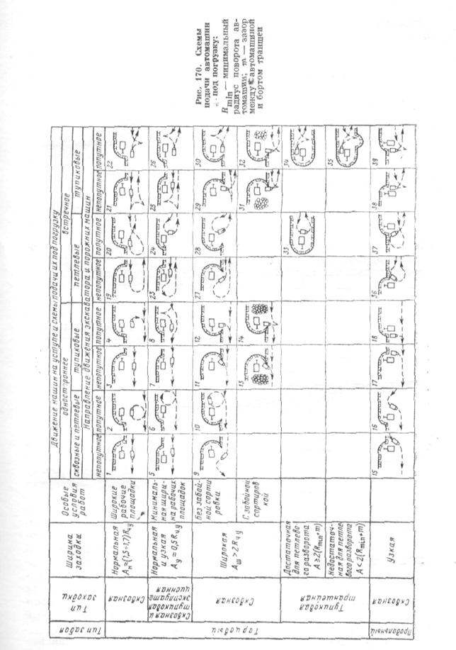 В связи с различными типами забоев и заходок, шириной заходок, характером движения машин па уступе (односторонним или встречным), соотношением направлений движения машин и экскаватора, высокой маневренностью автотранспорта возможно большое число схем подачи машин под погрузку.