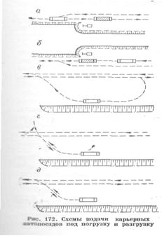 По отношению к направлению перемещения экскаватора по мере отработки заходки движение машин на уступе может быть попутным и непопутным. По способу подъезда машин к экскаватору (характеру маневров) все схемы подачи разделяются на три группы: сквозные, с петлевым разворотом, с тупиковым разворотом. Погрузка горной массы в кузов машины должна производиться сбоку или сзади, перенос ковша над кабиной но разрешается. В ожидании погрузки машина должна находиться вне радиуса действия ковша.