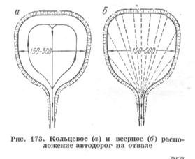 Во всех случаях стремятся так располагать подъездные отвальные дороги и разгрузочные площадки, чтобы все маневры производились в стороне от путей основного движения на отвале, без их пересечения, что особенно важно при большой интенсивности движения и неблагоприятных климатических условиях (туман, плохая видимость).