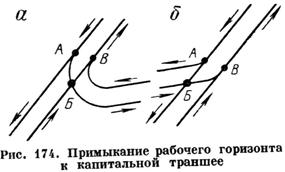 При правостороннем примыкании горизонта к капитальной траншее (рис. 174, а) пропускную способность пункта примыкания ограничивает пересечение порожними автосамосвалами, следующими на данный горизонт, грузовой полосы основной дороги (точка Б), и то время как въезд на дорогу груженых самосвалов с горизонта (точка В) не является ограничивающим. Если при подходе порожнего автосамосвала к точке А пункт Б занят груженым самосвалом, первый должен снизить скорость движения или остановиться.