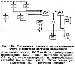 В приведенной схеме через датчики, размещенные под кузовом машины, информация о ее загрузке (в виде электрических импульсов) поступает в блоки учета массы и контроля загрузки. При достижении установленной нормы массы породы и кузове блок загрузки включает сигнальные устройства, оповещающие водителя и машиниста экскаватора о конце погрузки. В блоке учета нарастающим итогом ведется подсчет перевезенного машиной груза, что в конце смены отмечается в путевом листе водителя. Схема может быть дополнена автоматическим радиопередатчиком, информирующим о загрузке автомобиля диспетчерский пункт.