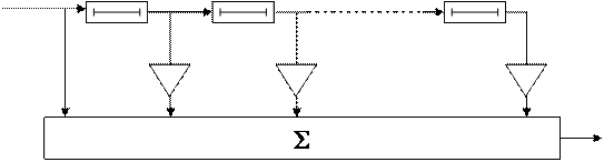 Достоинством модели АР является ее конструктивность, заключающаяся в возможности синтеза довольно простым образом алгоритмов обработки случайных процессов. На рис. 1 представлен АР фильтр предсказания (обеляющий фильтр), алгоритм действия которого описывается выражением (3). Он состоит из линий задержки, усилителей с коэффициентами усиления