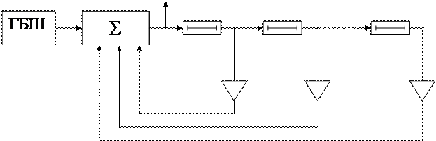 В задачах статистического моделирования часто возникает необходимость генерации случайного процесса с заданной корреляционной функцией или с заданной формой и характеристиками СПМ. Для этих целей эффективно использовать генератор процесса АР, показанный на рис. 2. Генерация случайного процесса осуществляется методом порождающего случайного процесса. Порождающий процесс в виде белого шума, обычно с гауссовой функцией распределения, пропускается через формирующий фильтр, параметры которого определяются соответствующей моделью АР.