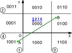 Классифицируем все точки в зависимости от их положения по отношению к отсекающим прямым 1, 2, 3, 4: поставим в соответствие каждой области 4-битный код.