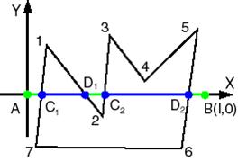 | б) его вершины лежат по разные стороны от Ax (например, на Рис. 5 1-2): заносим в список точку пересечения | |