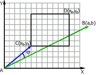Если нужно рисовать, то перейдем к канонической системе координат Axy, тогда наш отсекающий прямоугольник можно задать координатами своих левого нижнего C(x1,y1) и правого верхнего D(x2,y2) углов. Тогда в зависимости от знака векторного произведения [AB ´ AC] ( т.е. a*y1-b*x1) отрезок AB пересекает: