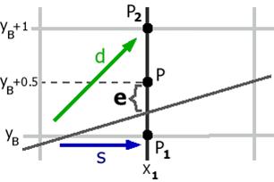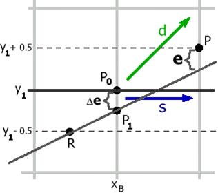 Найдем для двух случаев начальные значения x, y и e0 , далее будем действовать по алгоритму Брезенхема. Ради целочисленности алгоритма все переменные, связанные с e, по-прежнему домножены на 2a.