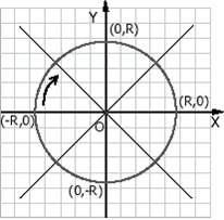 | Для начала перейдем к канонической системе координат, в которой центр окружности совпадает с началом координат. Тогда можно заметить, в силу симметрии окружности относительно прямых разделяющих октанты, что достаточно построить растровое представление в одном октанте, а затем с помощью симметрий получить изображения в других октантах. Будем пользоваться заданием окружности в виде неявной функции: x2+y2 - R2=0 Пусть f(x,y)= x2+y2 - R2 Будем рисовать кусок окружности в 4 октанте, начиная с точки (-R,0) Пусть R Î N, тогда f(x,y) Î Z для x Î Z, y Î Z. Пусть функция plot8 (x,y) изображает все 8 точек, полученных из (x,y) с помощью симметрий. |