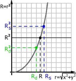 Но вычисление квадратного корня - вычислительно трудоемкая операция, поэтому при достаточно больших Rмы будем заменять сравнение расстояний сравнением приближенных значений их квадратов (см. Рис. 2):