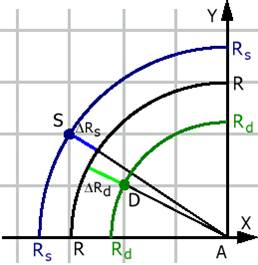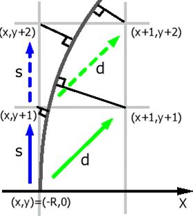 | Для того, чтобы выбрать один из двух возможных пикселов, будем сравнивать расстояния от них до окружности, где расстояние меньше - тот пиксел и будет искомым. В примере на Рис. 3 сравниваются расстояния от точек S и Dдо окружности с радиусом R.Из евклидовой метрики получаем: