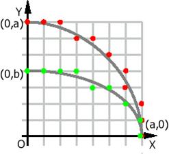 2) Воспользуемся тем, что эллипс с параметрами a,b; a > b получается из окружности радиуса a сжатием по оси y в a/b раз. Построим алгоритм, который является некой комбинацией алгоритмов Брезенхема для окружности и для отрезка.