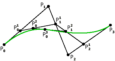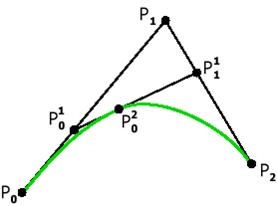 Наглядный метод построения этих кривых был предложен de Casteljau в 1959 году. Построим кривую по 3 опорным точкам (Рис. 5). Метод de Casteljau основан на разбиении отрезков, соединяющих исходные точки в отношении t (значение параметра), а затем в рекурсивном повторении этого процесса для полученных отрезков.
