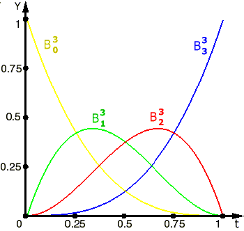 называются базисными многочленами Бернштейна n степени (а также весовыми функциями Безье/Бернштейна). На рисунках ниже изображены многочлены Бернштейна 3 и 4 степеней