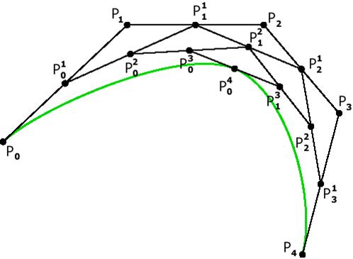 Если рассмотреть участок между и , взятых для t=0,5, то он может быть задан как кривая Безье с опорными точками , аналогичные рассуждения справедливы и для участка между и . Таким образом будем применять этот алгоритм рекурсивно для левой и правой частей, пока размер кривой не станет меньше размера пиксела.
