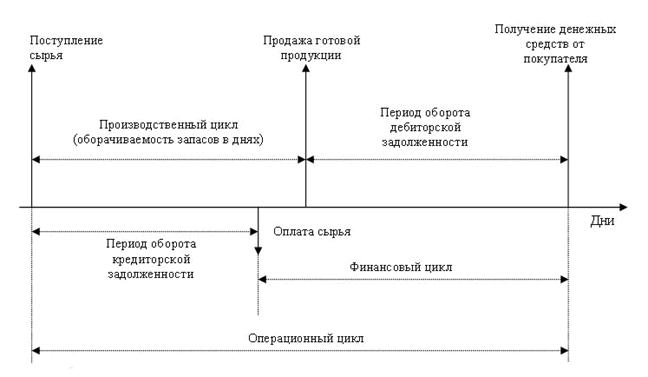 Операционный цикл характеризует общее время, в течение которого финансовые ресурсы обездвижены в запасах и дебиторской задолженности. Характеризует период полного оборота всей суммы оборотных активов. Операционный цикл состоит из периода оборачиваемости производственных запасов и периода погашения дебиторской задолженности.