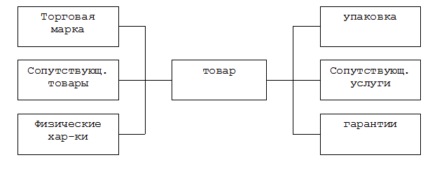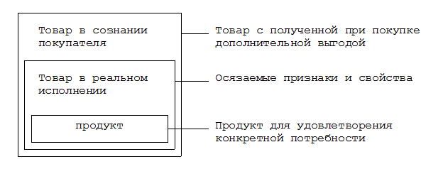 Каждый товар можно рассматривать на трех уровнях. На первом уровне он рассматривается как продукт, наличие которого дает ответ на вопрос, для удовлетворения какой потребности данный товар приобретается. На втором уровне он представляется как товар с определенным набором свойств (оформление, качество, название и т.д.). На третьем уровне товар рассматривается в его реальном исполнении в совокупности с предлагаемыми дополнительными выгодами (доставка, установка, обслуживание).