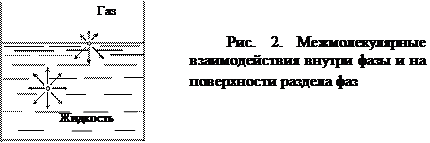 Механизм возникновения поверхностной энергии рассмотрим на примере системы жидкость – газ (рис. 2). Для молекул, находящихся в объеме жидкой фазы, силы межмолекулярного взаимодействия симметричны, равнодействующая их равна 0.