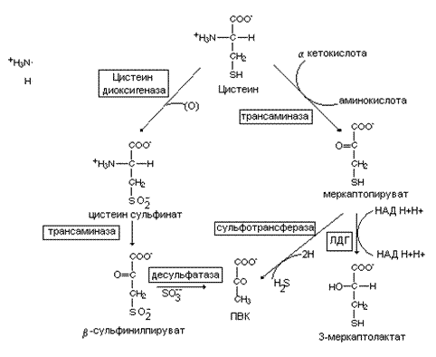 С катаболизмом глицина тесно связан и обмен треонина. Альдолаза треонина –инициатор катаболизма этой аминокислоты. Под ее влиянием треонин распадается на молекулу глицина и уксусного альдегида. Уксусный альдегид восстанавливается при участии альдегиддегидрогеназы в уксусную кислоту, которую можно при помощи ацетаттиокиназы превратить в ацетилКоА. Второй путь катаболизма треонина включает специфическое дезаминирование этой аминокислоты при помощи серин-треонин дезаминазы, Образующийся при этом оксобутират может быть использован в синтезе аминокислот с разветвленным углеводородным радикалом.