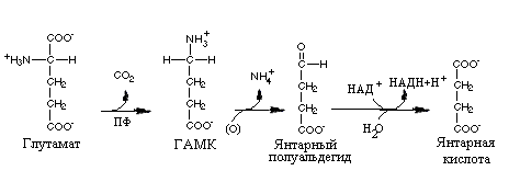 Катаболизм g-аминобутирата начинается с потери аминогруппы и образования янтарного полуальдегида. Последний может быть восстановлен в g-гидроксибутират при участии L-лактатдегидрогеназы, либо окислиться с образованием янтарной кислоты и затем в цикле лимонной кислоты до СО2 и Н2О.