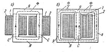 Виды магнитопроводов – подразделяются на стержневые и броневые. Магнитопровод однофазного стержневого трансформатора имеет два стержня С для размещения обмоток и два ярма Я.