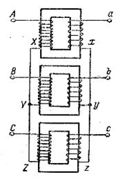 Рис. 12-25. трехфазный трансформатор со схемой и группой соединений Y/D-11