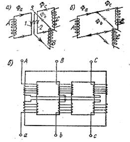 Поэтому если объединить три стержня 1, 2, 3 в общий стержень, то поток в нем будет равен нулю, и его можно удалить. Тогда получим трехфазный трехстержневой трансформатор. Конструкцию этого трансформатора можно упростить, расположив все три стержня в одной плоскости, что было предложено Доливо-Добровольским в 1889г. Эта конструкция получила всеобщее распространение. Влияние несимметрии магнитных линий (для средней фазы их длина несколько короче) весьма незначительно.