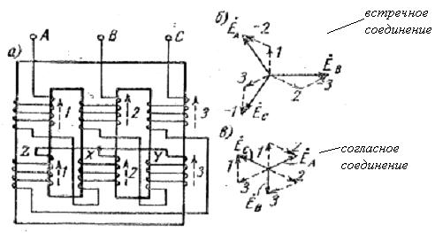 В некоторых случаях выполняют соединение обмоток по схеме зигзага, когда фаза обмотки разделяется на две части, которые располагаются на разных стержнях и соединяются последовательно. При этом вторая половина обмотки подключается встречно первой, потому что при встречном соединении (см. рис. 12-22,б) э.д.с. фазы в