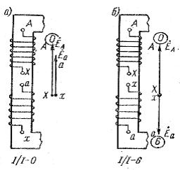 На рис. 12-23 а, показаны обмотки однофазного трансформатора, намотанные по левой винтовой линии и называемые поэтому левыми, причем у обоих обмоток начала А, а находятся сверху, а концы Х, х – снизу. Будем считать э.д.с. положительной, если она действует от конца обмотки к ее началу, а обмотки сцепляются с одним и тем же потоком. Вследствие этого э.д.с. этих обмоток в каждый момент времени действует в одинаковых направлениях. Поэтому э.д.с. ЕА и Еа совпадают по фазе.