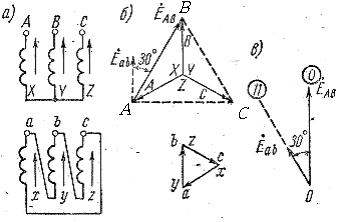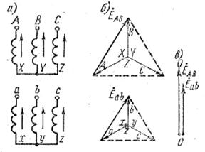Если же у одной из обмоток переменить начало и конец (рис. 12.23, б), то направление э.д.с., изменится на обратное, и э.д.с. ЕА и Еа будут иметь сдвиг на 180°. Такой же результат получится, если одну из обмоток выполнить «правой».