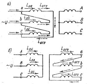 Поэтому токи этих гармоник будут циркулировать внутри замкнутого треугольника (рис. 13-3, а), причем будучи равными по значению и совпадая по фазе, они образуют общий замкнутый циркуляционный ток.