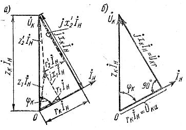 Векторная диаграмма трансформатора при коротком замыкании с Iк = Iн изображена в двух видах на рис. 14-15, а, б. Треугольник на рис. 14-15, б называется треугольником короткого замыкания. Его катеты представляют собой активную и реактивную составляющие напряжения короткого замыкания: