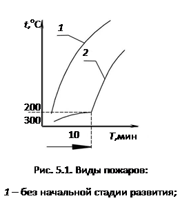 Область применения пожарных автоцистерн определяется условиями развития пожаров, которые можно разделить на два вида. Первый вид пожаров – без начальной стадии развития – характеризуется кривой 1 на рис. 5.1. На объектах, в которых температура при возникновении пожара может нарастать подобным образом, рекомендуется внедрять автоматические установки пожаротушения.