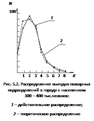 где λ – среднее число выездов в единицу времени; τ– любой промежуток времени; e– основание натуральных логарифмов, 2,72; К = 1,2,3… К – число выездов. Для приведенного распределения на рис. 5.2 в течение 33 суток в году не было ни одного выезда, 78 раз было по одному выезду и т.д. Таким образом, ПА должны быть приспособлены к использованию в любые случайные промежутки времени суток. Это требует содержания их в постоянной боевой готовности, что осуществляется как конструкцией ПА, так и организацией их содержания.