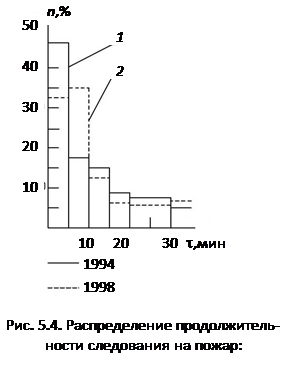Следование на пожар определяется по среднестатистическим данным. Так, за период 1994 – 1999 гг. получены следующие результаты, приводимые в табл.5.1.