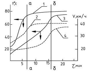 t охл= 80 оС будет различным, различной будет и скорость движения (рис. 5.5). Поэтому становится значимым температурный режим двигателя при содержании АЦ в гарнизонах пожарных частей. Прямые а и б характеризуют начало установившихся режимов прогрева и скорости.