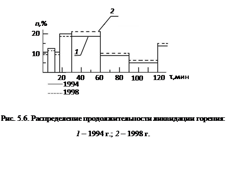Продолжительность ликвидации горения изменяется в очень широких пределах (рис. 5.6). До 10 мин ликвидируется около 20 % пожаров. Это время соизмеримо со временем следования на пожар. От 30 до 60 мин тушат до 20 % пожаров и т.д. Однако около 14 % пожаров тушат более двух часов. Тушение крупных пожаров может производиться в течение 5 – 6 ч и более в случае затяжных пожаров.
