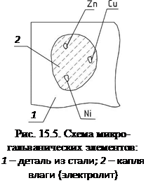 Источником электрического тока является разность электродных потенциалов различных частиц металла. Пусть, например, на фрагменте металлической детали находятся Zn, Сu и Fе (рис. 15.5). Их электронные потенциалы соответственно равны –0,76; +0,34 и –0,23 В. Под каплей влаги, являющейся электролитом, образуются три микрогальванические элемента. Кроме того, каждый из них образует микрогальванический элемент со сталью (-0,36 В). Частицы с более отрицательным электродным потенциалом будут разрушаться.