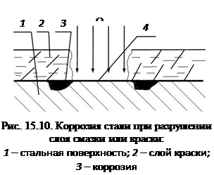 При его разрушении, например, ударом тяжелого предмета или царапина коррозия внешне не заметна. Она развивается под слоем эмали (рис. 15.10). Это обусловлено тем, что окисляющийся очищенный металл имеет более положительный электродный потенциал. Поэтому необходимо расширить разрушенный слой, удалить образовавшиеся следы коррозии и полностью восстановить окрашенный слой. Аналогичным образом поступают и при восстановлении защитного слоя смазками.