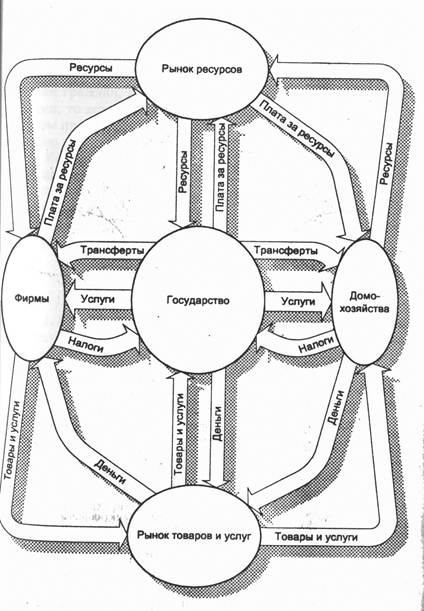 В модели кругооборота деловой активности, изображенной на рисунке 5, в качестве участника рыночной деятельности включено государство. Как видим, государство также является активным участником экономической деятельности. Оно предоставляет домашним хозяйствам и фирмам возможность пользоваться своими услугами (например, национальная оборона страны, система общего образования, бесплатное медицинское обслуживание и др.). Для того чтобы обеспечить производство этих услуг, государство собирает необходимые денежные средства в виде налогов, которые уплачивают в государственный бюджет фирмы и домохозяйства. Необходимые для своей деятельности ресурсы, товары и услуги государство закупает у домохозяйств и фирм на рынке ресурсов и рынке товаров и услуг.