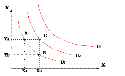 На кривой U1 находится два набора товаров A и B. Во втором наборе B больше товара X и меньше товара Y, но наборы равноценны.