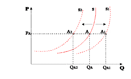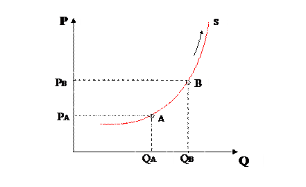 Точки А и В на кривой предложения – величины. Они курсируют по кривой S под влиянием изменения цены.