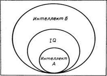 Иногда в литературе биологический интеллект обозначается как интеллект А, социальный - как интеллект Б; при этом ясно, что интеллект Б гораздо шире, чем А, и включает в себя IQ; IQ, в свою очередь, шире, чем интеллект А, и включает его в себя (рис. 4). Таким образом, из трех концепций та, которая касается интеллекта А (биологического интеллекта), может рассматриваться как фундаментальная.