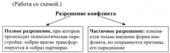 - Как вы думаете, какие условия влияют на развитие социального конфликта? (Примерный ответ. Намерения участников конфликта либо добиться компромисса, либо полностью устранить соперников; отношения к средствам физического насилия; уровень доверия между сторонами; адекватность оценок конфликтующими сторонами истинного положения дел; внешние обстоятельства.)
