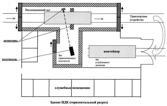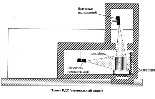 Техническая реализация радиационного метода интроскопии металлических конструкций контейнеров и трейлеров, больших объёмов грузов, состоящих, в том числе и из материалов высокой плотности, требует применения источников ионизирующего излучения высоких энергий. Для обеспечения требований радиационной безопасности процесс сканирования объектов досмотра должен осуществляться в специально построенных зданиях, обеспечивающих выполнение санитарных норм. В мировой практике для досмотра крупногабаритных объектов нашли применение инспекционно-досмотровые комплексы (ИДК) (см. рис. 4).
