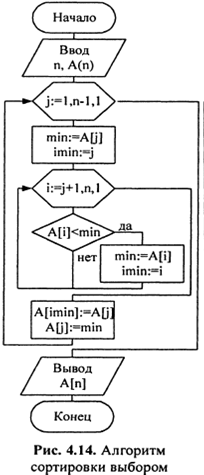 Выбирается минимальный элемент массива и меняется местами с первым элементом массива. Затем процесс повторяется с оставшимися элементами и т. д.