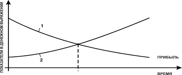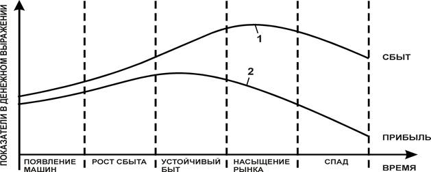 Из рисунка видно, что с появлением новой конкурентоспособной машины сбыт (кривая 1) быстро увеличивается достигает максимума и по мере насыщения потребительского рынка начинает сокращаться. Аналогично изменяется прибыль (кривая 2) предприятия – изготовителя. Максимумы кривых сбыта и прибыли, как правило не совпадают во времени вследствие инерции производства.