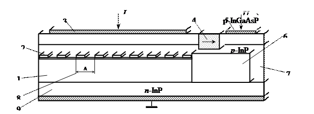На лазерный волноводный кристалл 1 нанесена дифракционная решетка Брэгга 2. Непосредственно к нему справа примыкает входная грань волноводного электроабсорбционного модулятора (ЭАМ) 6, в котором управление световыми потоками осуществляется путем поглощения света, связанного с резонансным переходом электронов из валентной зоны в зону проводимости. На нижней и верхней гранях устройства нанесен электропроводящий слой (электрод) 3 для подвода электрического тока накачки Jн к лазерному кристаллу с РОС. Для подключения модулирующего сигнала к ЭАМ в правой части также нанесен электропроводящий слой 5. Электроды 3 и 5 оптически изолированы друг от друга полупроводниковым изолятором 4 на основе соединения InP. Модулированное по интенсивности излучение выходит через окно 7, поверхность которого покрыта противоотражающим слоем. Перечисленные элементы размещены на подложке 9, выполненной из материала n-InP.
